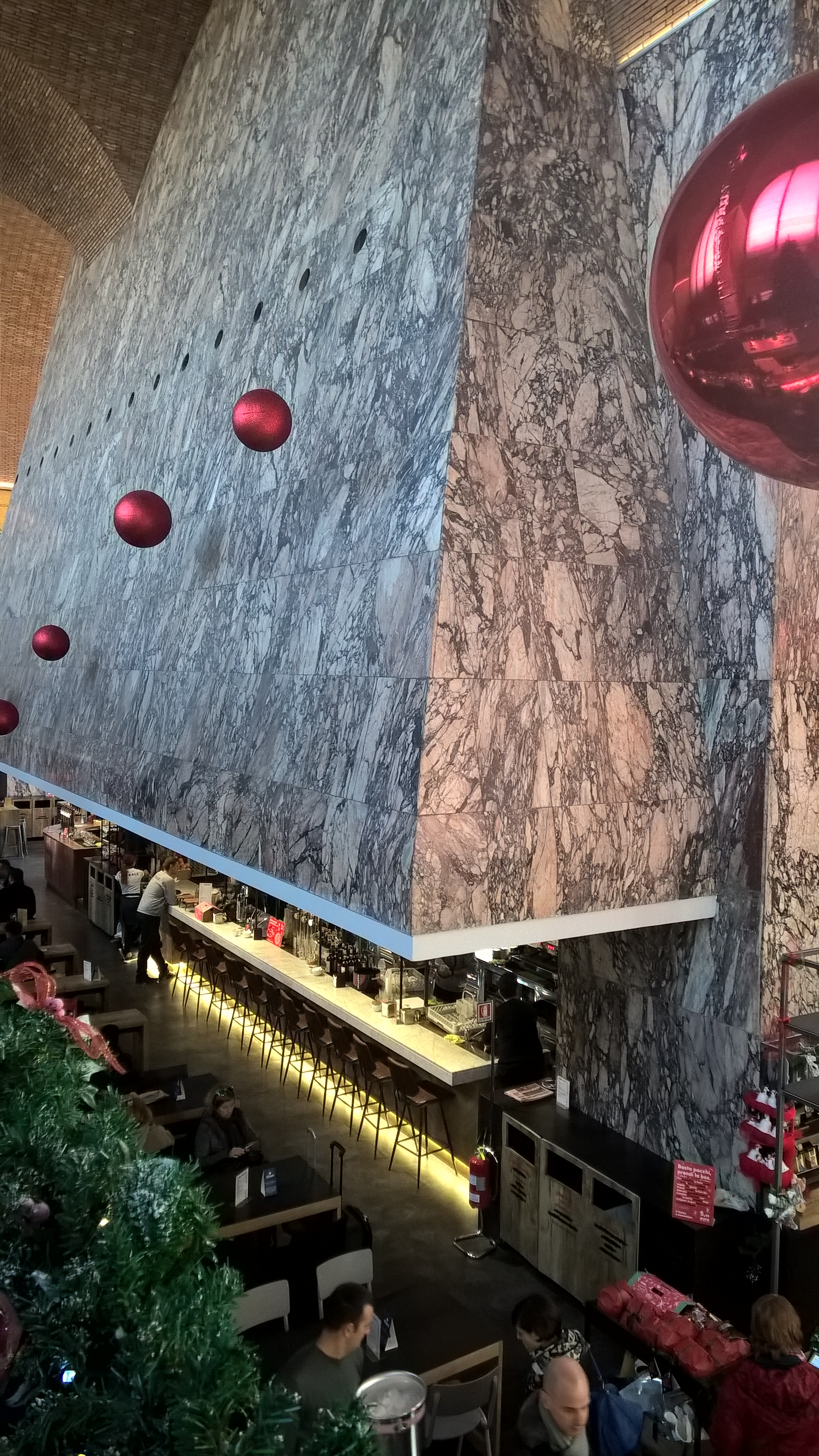 Il progetto è dello studio fiorentino Q-bic, ruota tutto intorno ad una grande Cappa in marmo che percorre la doppia altezza, al piano terra una serie di corner dal dolce al salato, al primo piano un ristorante con tavolini affacciato sui banchi e illuminato dalle grandi vetrate che guardano via Giolitti.