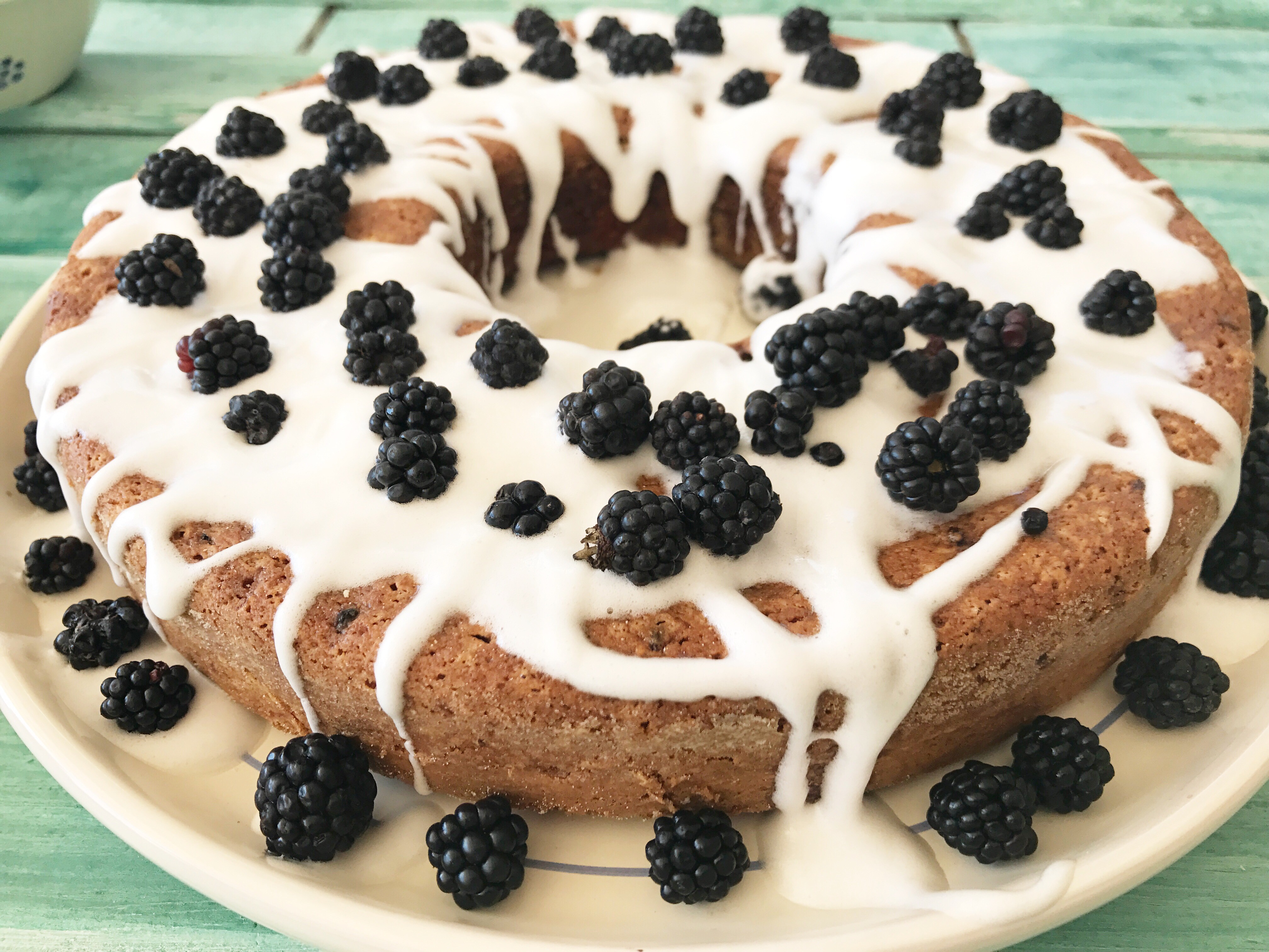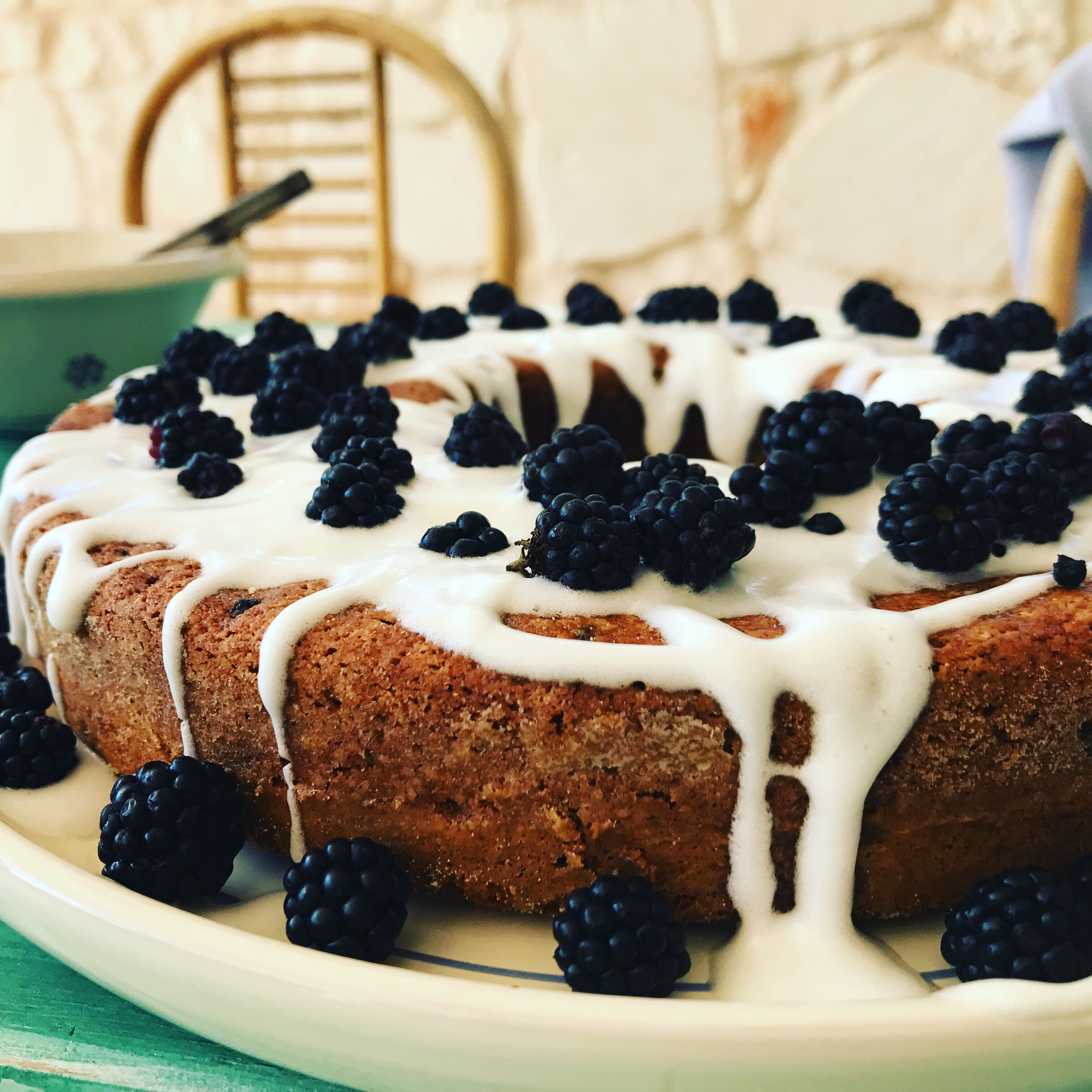Lasciate raffreddare la torta e sformatela capovolgendo la pentola su un piatto da portata; versate la glassa sulla ciambella e decorate sopra e intorno con le more.