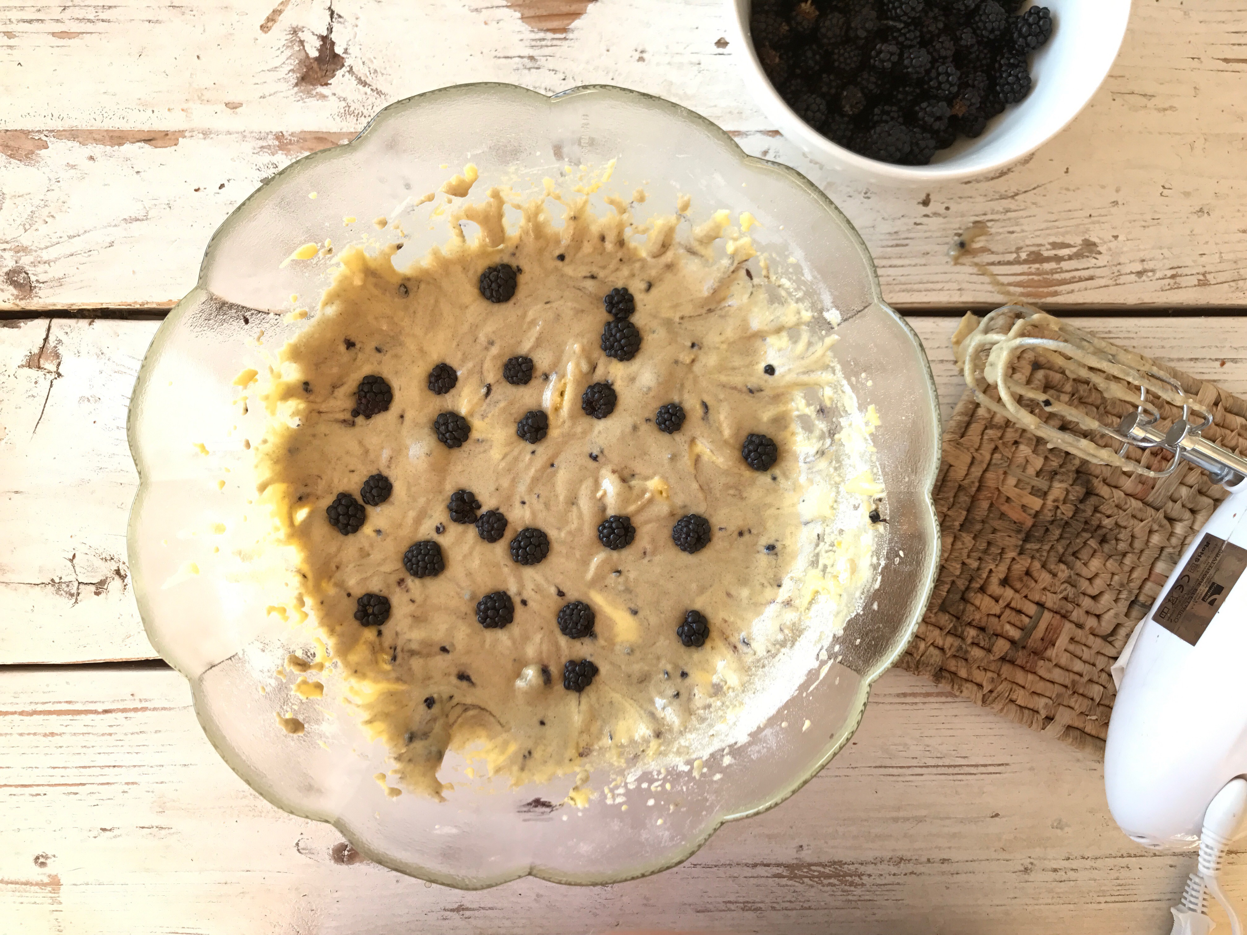 Imburrate (io sempre con la margarina) e infarinate l’interno del fornetto, versate il composto e decorate la superficie con le more restanti.