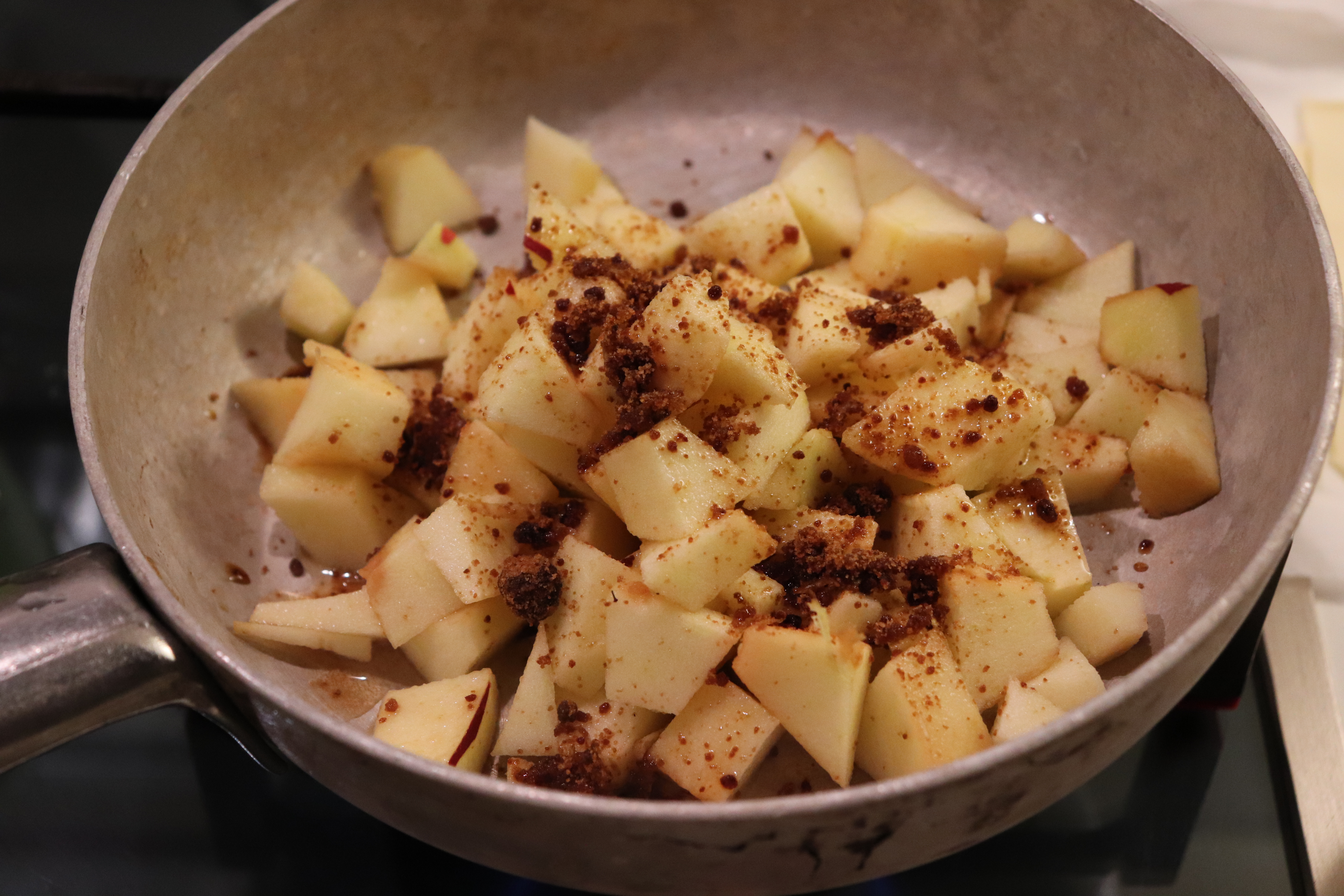 Sbucciate e tagliate le mele a dadini, mescolate lo zucchero con la cannella e la scorza del limone grattugiato, spadellate qualche minuto le mele condite con lo zucchero e una spruzzata di limone, lasciandone un pò da parte.