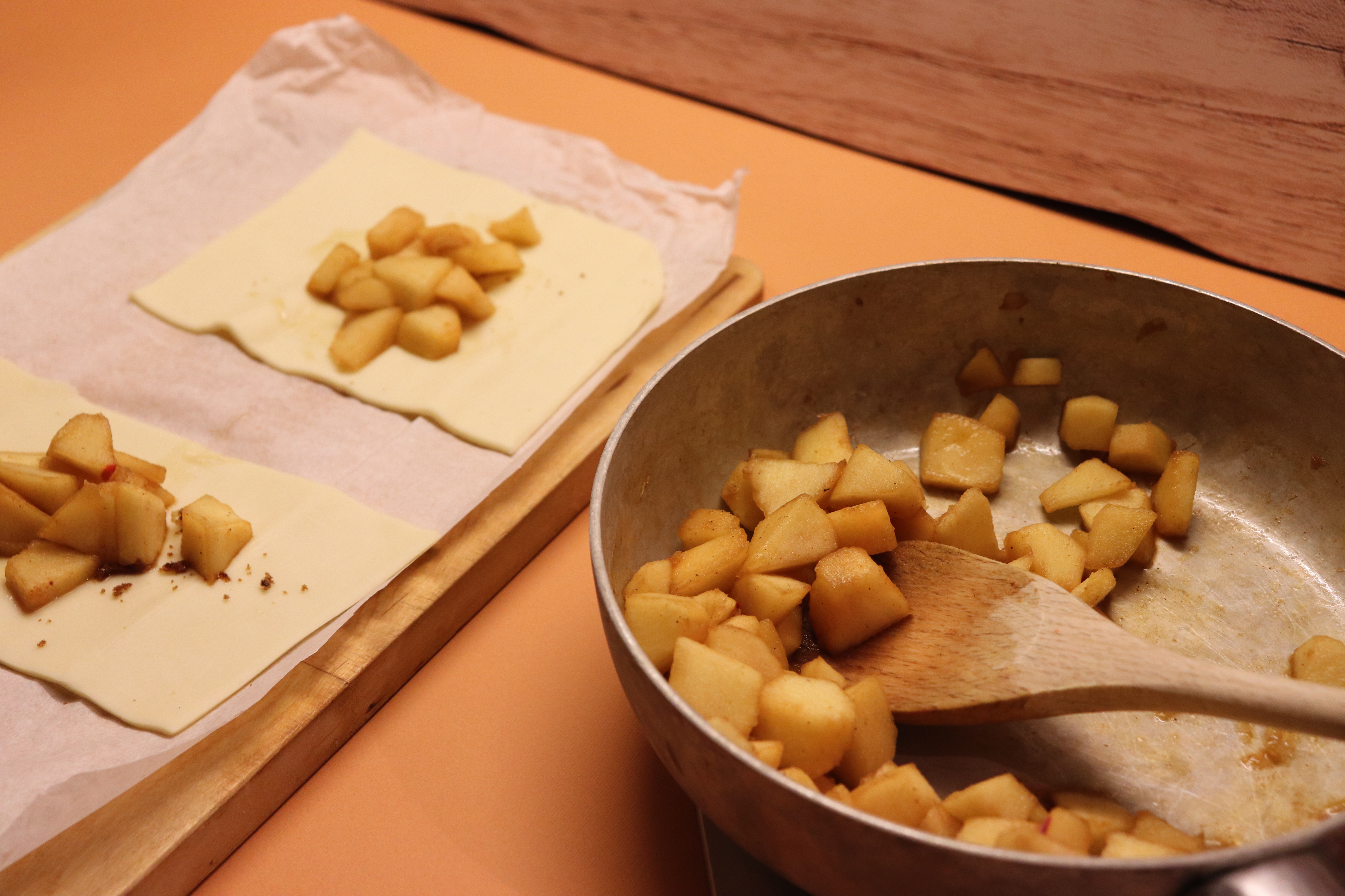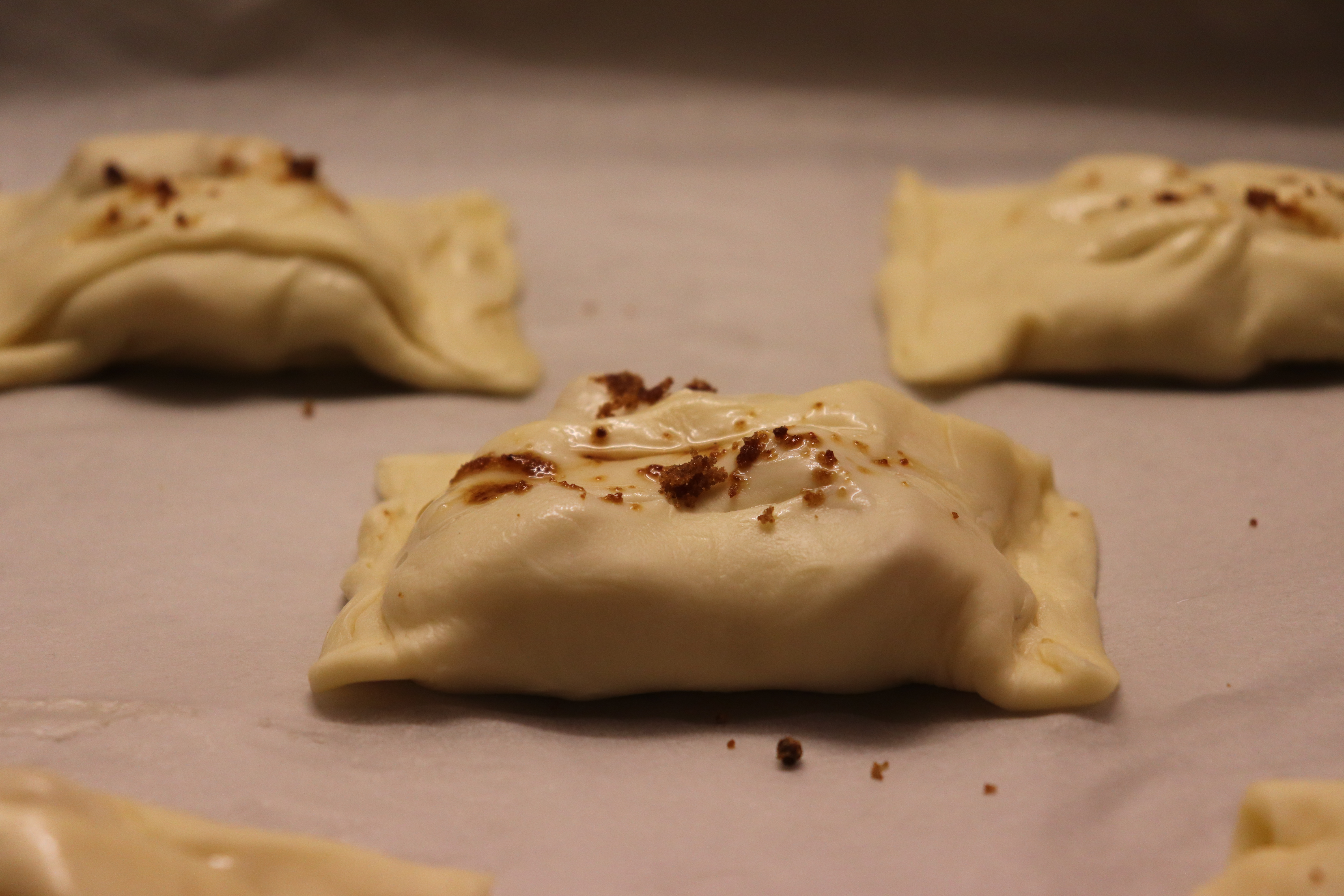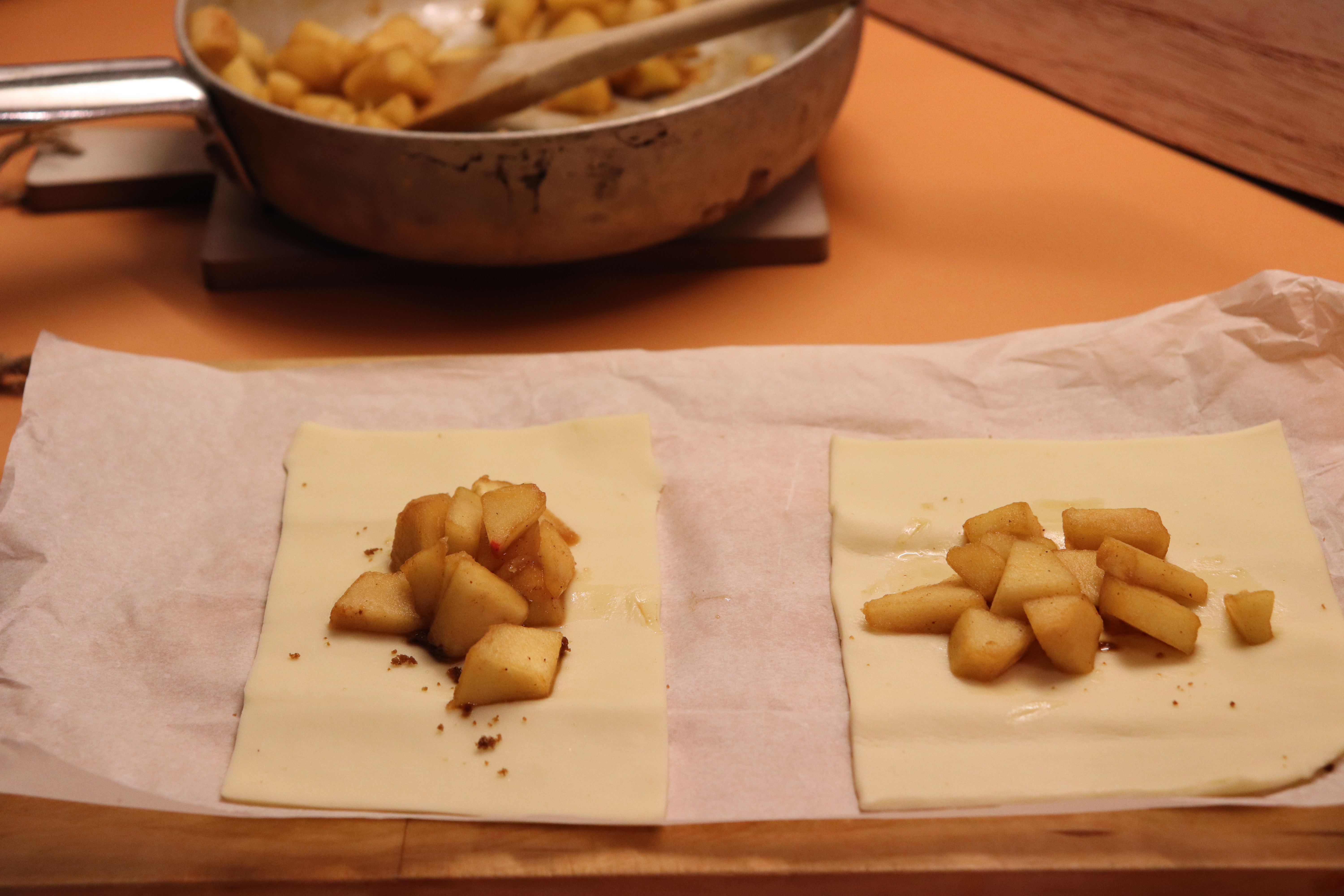 Mettete un pò di zucchero e le mele, chiudete su sé stesso ogni rettangolo spennellando con la chiara d’uovo. Fate dei piccoli tagli sulla superficie, spennellate con la chiara e spolverate con lo zucchero.