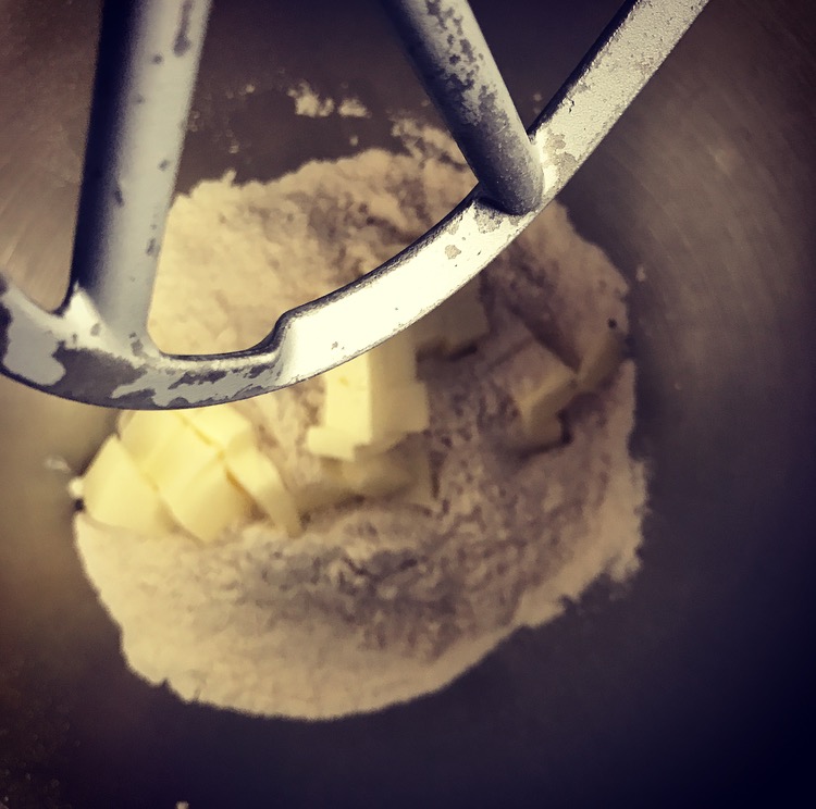 Mettete nella planetaria la farina, il burro a pezzi freddo di frigo, un pizzico di sale e impastate fino ad ottenere una consistenza granulosa.