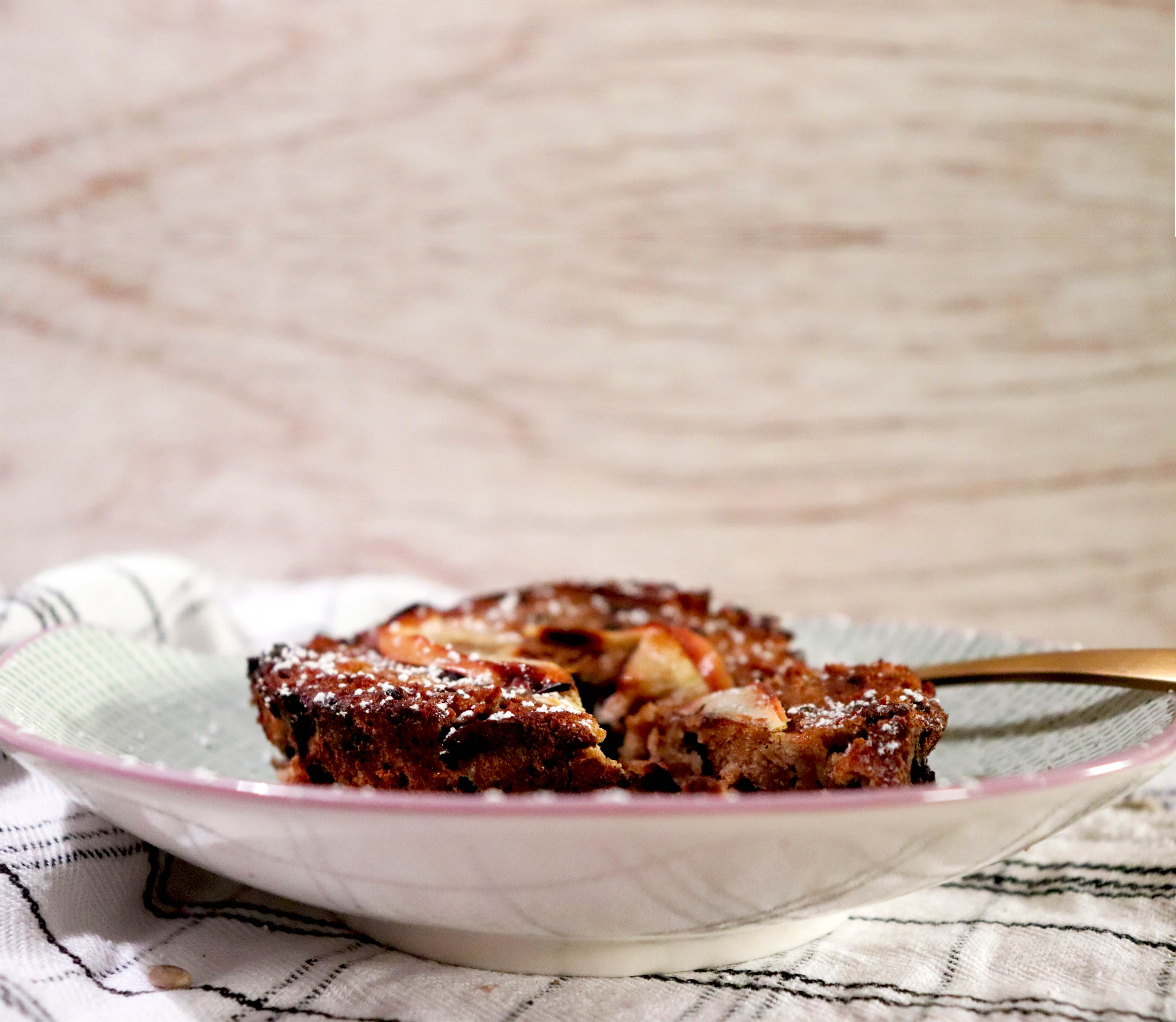 Sbattete l’uovo e mescolate il pane con tutti gli ingredienti lasciando da parte la mela, il burro e lo zucchero a velo.